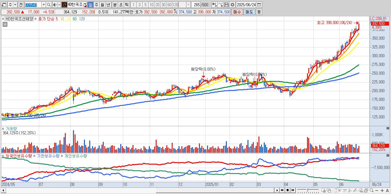- HD한국조선해양 (392,000원 ▲ 4.39% , 시총: 277,431억, 거래량: 289,076, 거래대금:1,122억, KOSPI)