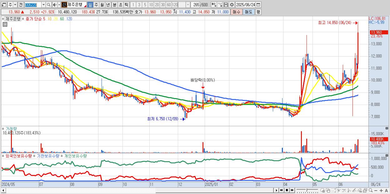 - 제주은행 (13,840원 ▲ 20.87% , 시총: 5,231억, 거래량: 3,645,754, 거래대금:460억, KOSPI)