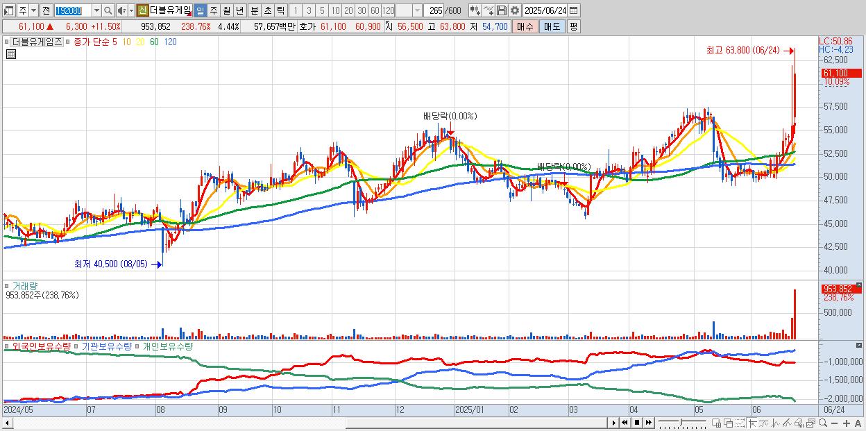 - 더블유게임즈 (62,100원 ▲ 13.32% , 시총: 13,349억, 거래량: 645,111, 거래대금:391억, KOSPI)