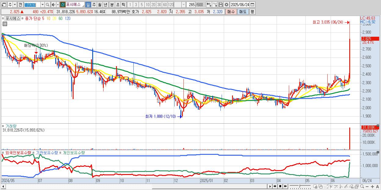 - 포시에스 (2,825원 ▲ 20.47% , 시총: 772억, 거래량: 31,818,226, 거래대금:890억, KOSDAQ)