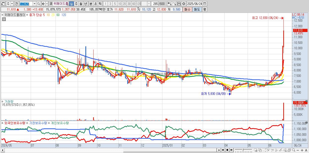 - 위메이드플레이 (11,610원 ▲ 13.49% , 시총: 1,332억, 거래량: 15,879,573, 거래대금:1,851억, KOSDAQ)