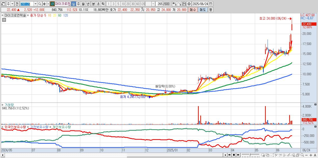 - 마이크로컨텍솔 (22,400원 ▲ 12.68% , 시총: 1,862억, 거래량: 840,756, 거래대금:189억, KOSDAQ)