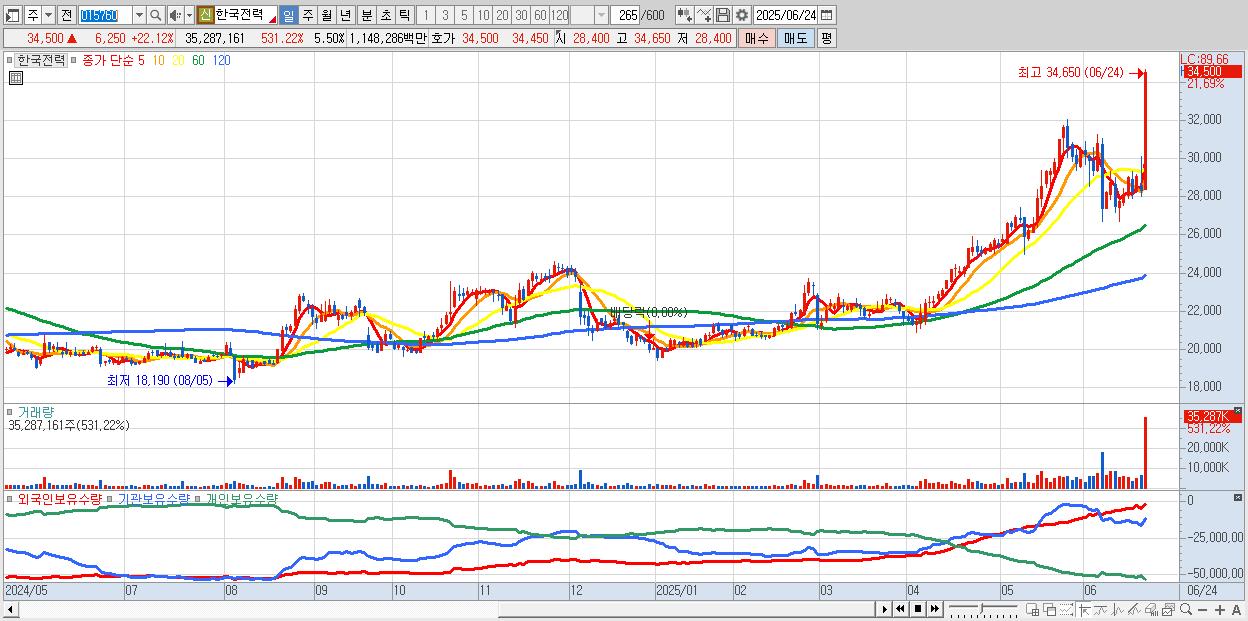 - 한국전력 (34,100원 ▲ 20.71% , 시총: 218,910억, 거래량: 19,728,999, 거래대금:6,422억, KOSPI)