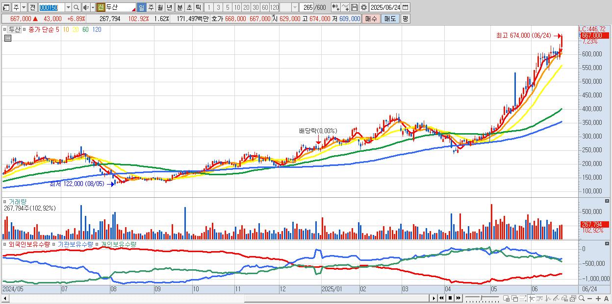 - 두산 (670,000원 ▲ 7.37% , 시총: 110,710억, 거래량: 186,990, 거래대금:1,198억, KOSPI)