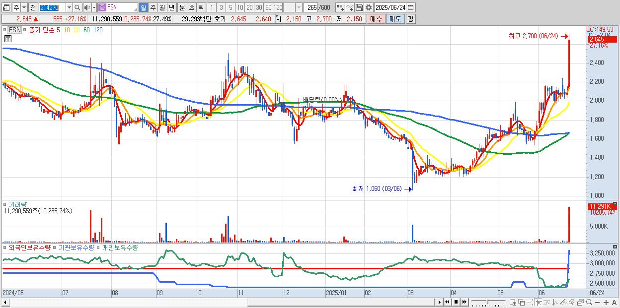 - FSN (2,645원 ▲ 27.16% , 시총: 1,086억, 거래량: 11,290,559, 거래대금:293억, KOSDAQ)
