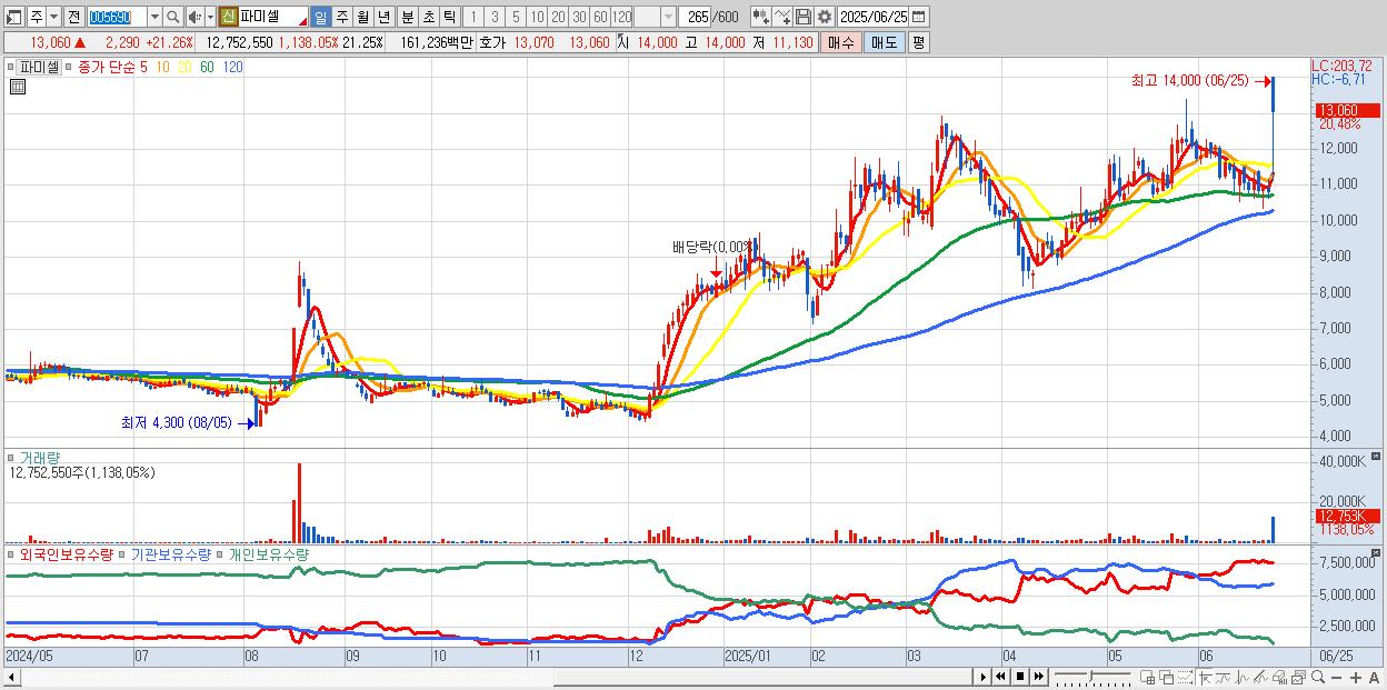 - 파미셀 (12,850원 ▲ 19.31% , 시총: 7,712억, 거래량: 7,430,137, 거래대금:941억)