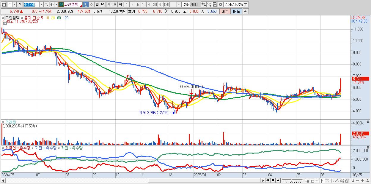 - 파인엠텍 (6,700원 ▲ 13.56% , 시총: 2,478억, 거래량: 1,288,727, 거래대금:83억)