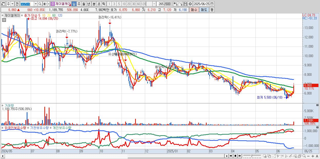 - 제이엘케이 (7,030원 ▲ 13.39% , 시총: 1,795억, 거래량: 802,014, 거래대금:54억)