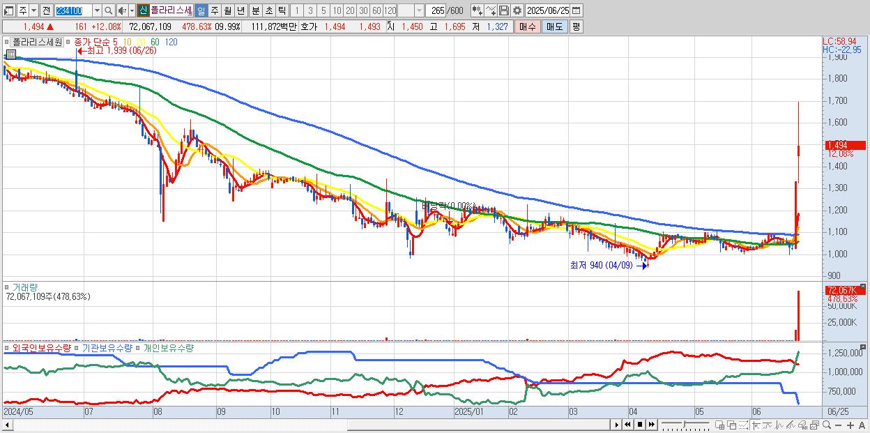 - 폴라리스세원 (1,494원 ▲ 12.08% , 시총: 979억, 거래량: 72,067,109, 거래대금:1,119억)