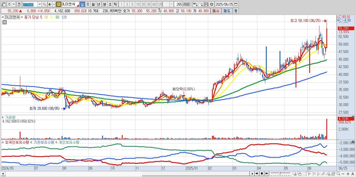 - DL이앤씨 (55,400원 ▲ 14.46% , 시총: 21,436억, 거래량: 2,461,511, 거래대금:1,373억)