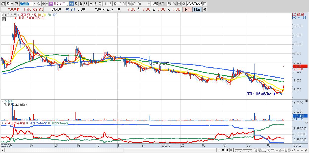 - 에이비온 (7,600원 ▲ 29.91% , 시총: 2,176억, 거래량: 103,456, 거래대금:8억)