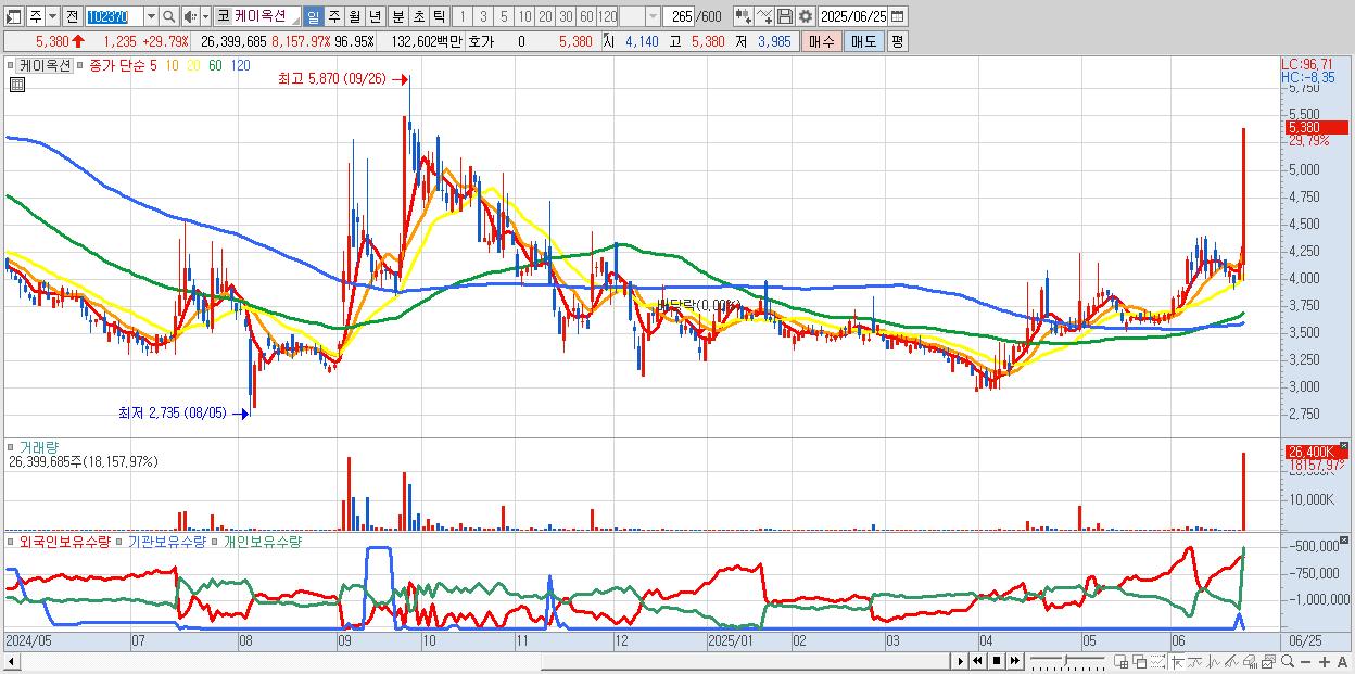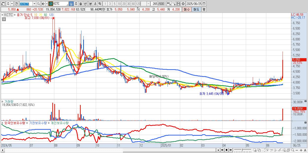 - KCTC (5,050원 ▲ 20.53% , 시총: 1,515억, 거래량: 19,054,538, 거래대금:984억)