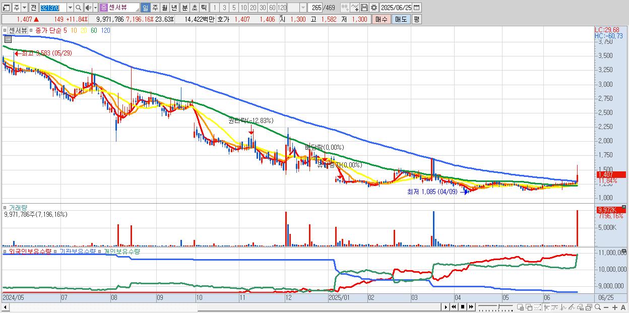 - 센서뷰 (1,407원 ▲ 11.84% , 시총: 594억, 거래량: 9,971,786, 거래대금:144억)