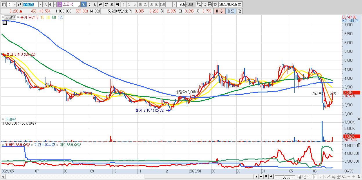 - 스코넥 (3,205원 ▲ 16.55% , 시총: 411억, 거래량: 1,860,038, 거래대금:57억)