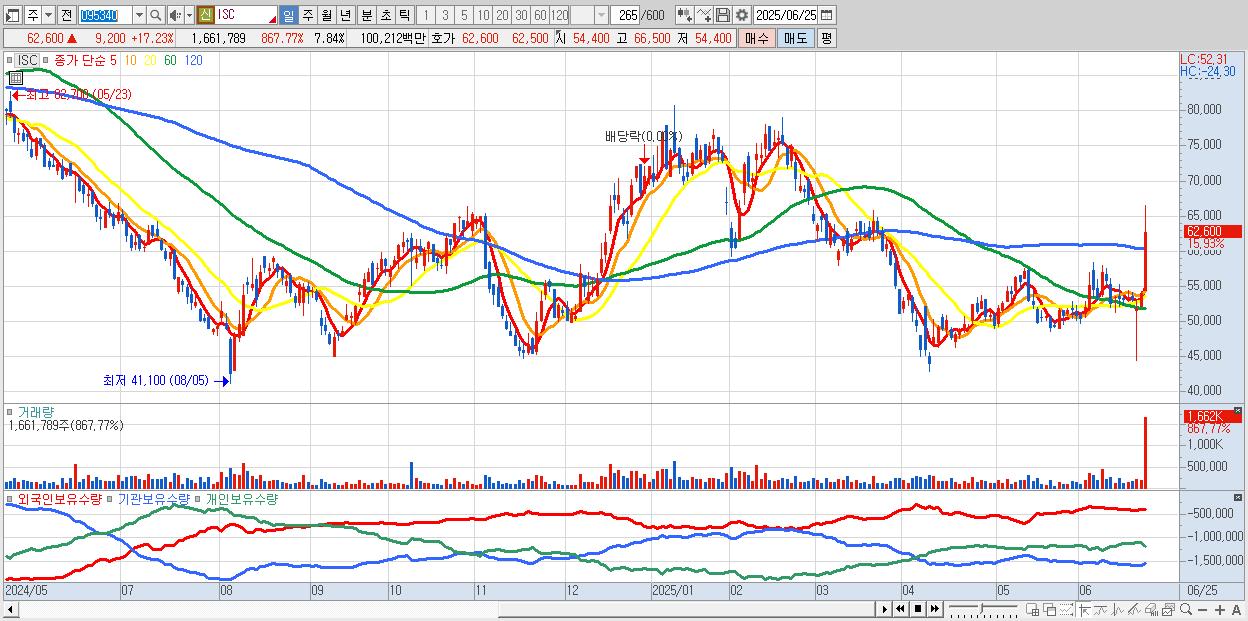 - ISC (62,000원 ▲ 16.1% , 시총: 13,142억, 거래량: 808,376, 거래대금:481억)