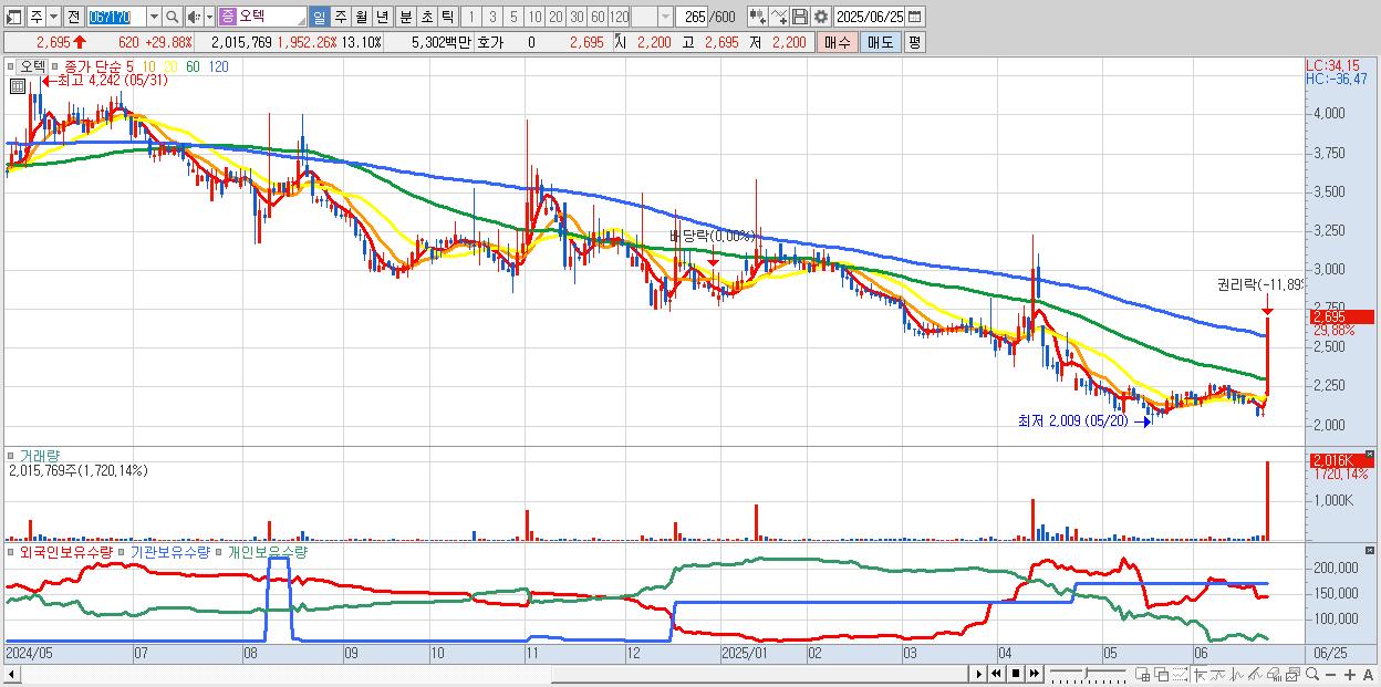 - 오텍 (2,695원 ▲ 29.88% , 시총: 415억, 거래량: 2,015,769, 거래대금:53억)