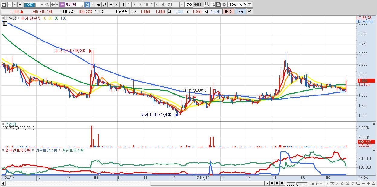 - 케일럼 (1,858원 ▲ 15.19% , 시총: 498억, 거래량: 368,772, 거래대금:7억)