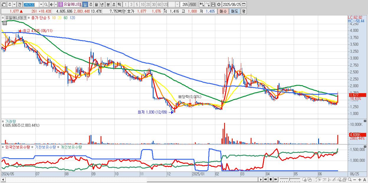- 유일에너테크 (1,677원 ▲ 18.43% , 시총: 574억, 거래량: 4,605,686, 거래대금:78억)