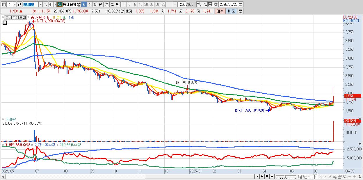 - 롯데손해보험 (1,934원 ▲ 11.15% , 시총: 6,002억, 거래량: 23,362,875, 거래대금:464억)