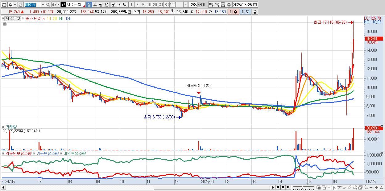 - 제주은행 (15,400원 ▲ 11.27% , 시총: 5,821억, 거래량: 10,612,094, 거래대금:1,625억)