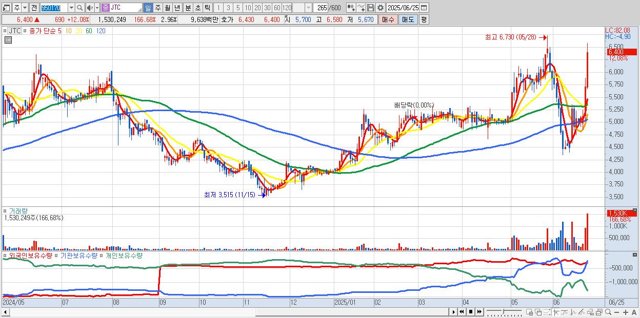 - JTC (6,400원 ▲ 12.08% , 시총: 3,312억, 거래량: 1,530,249, 거래대금:96억)