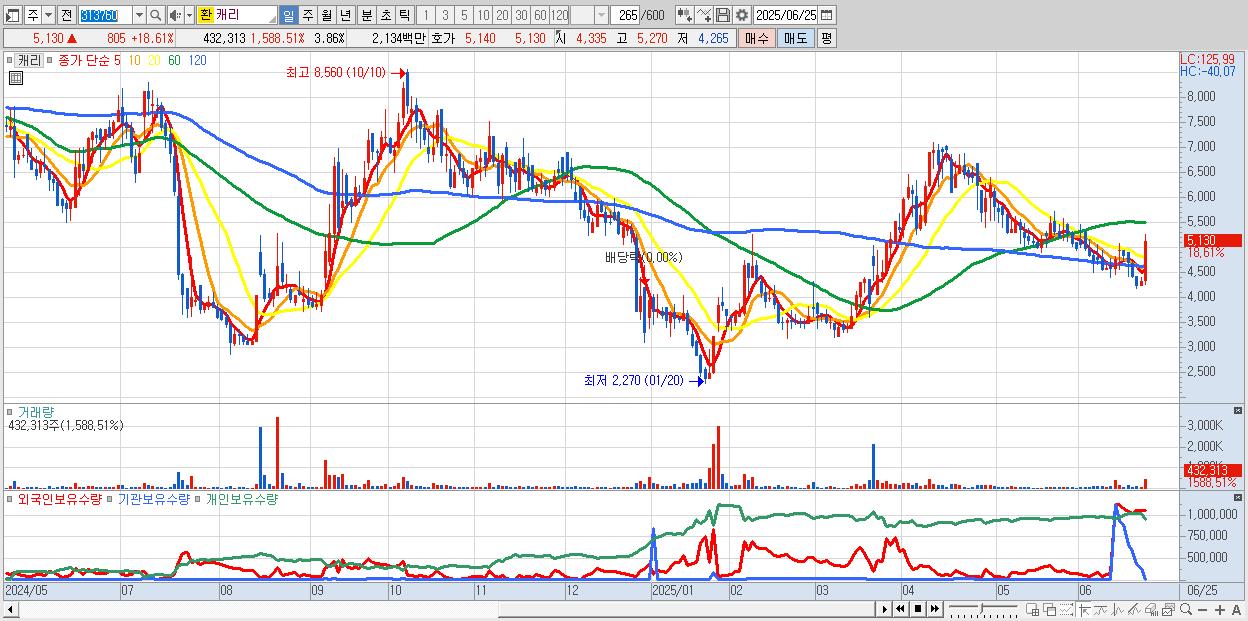 - 캐리 (5,130원 ▲ 18.61% , 시총: 575억, 거래량: 432,313, 거래대금:21억)