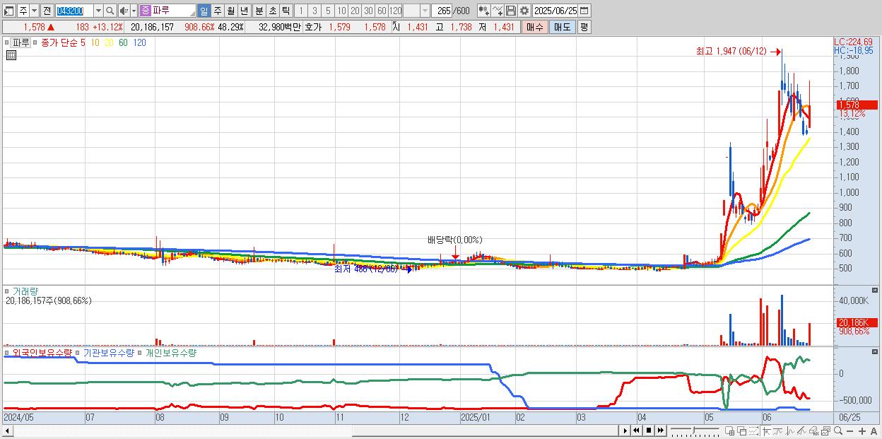 - 파루 (1,578원 ▲ 13.12% , 시총: 660억, 거래량: 20,186,157, 거래대금:330억)