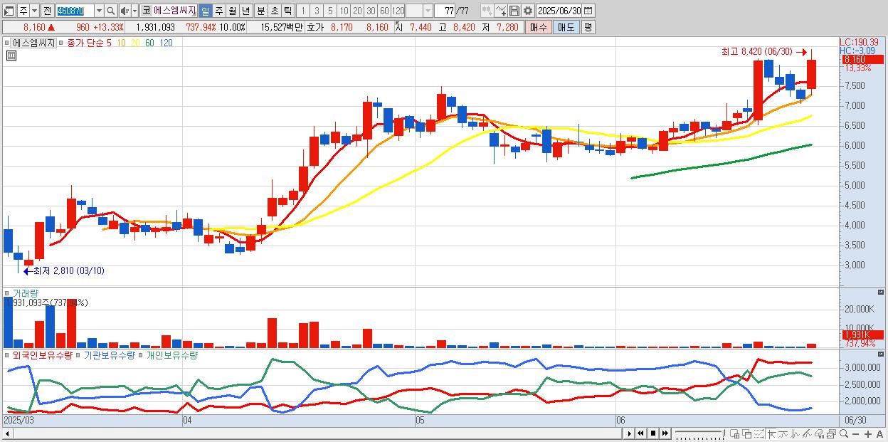 - 에스엠씨지 (8,160원 ▲ 13.33% , 시총: 1,575억, 거래량: 1,931,093, 거래대금:155억)