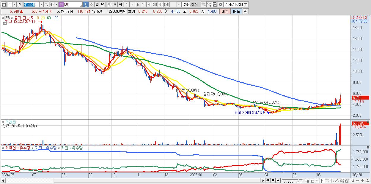 - E8 (5,240원 ▲ 14.41% , 시총: 673억, 거래량: 5,471,914, 거래대금:291억)