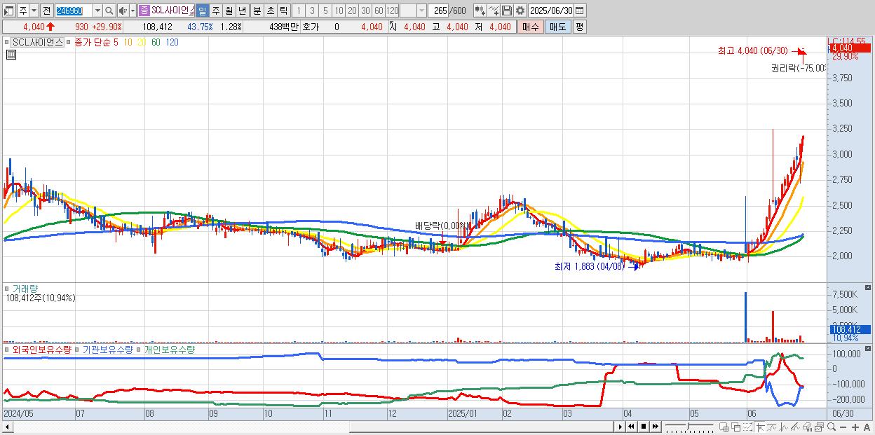 - SCL사이언스 (4,040원 ▲ 29.9% , 시총: 343억, 거래량: 108,412, 거래대금:4억)