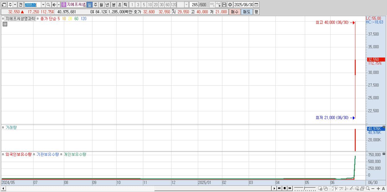 - 지에프씨생명과학 (32,550원 ▲ 112.75% , 시총: 1,701억, 거래량: 40,975,681, 거래대금:12,850억)