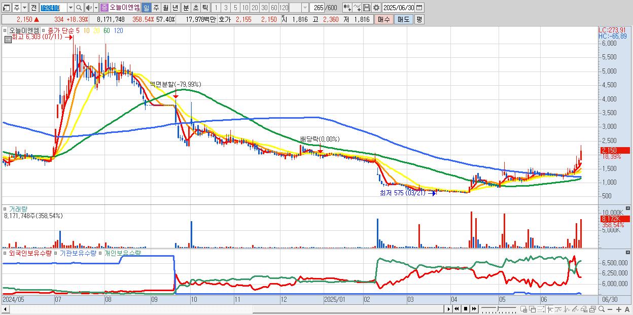 - 오늘이엔엠 (2,150원 ▲ 18.39% , 시총: 306억, 거래량: 8,171,748, 거래대금:180억)