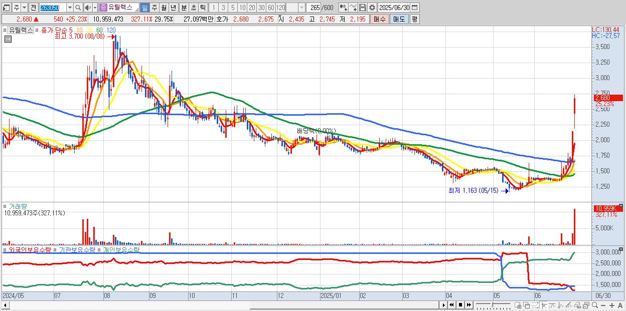 - 유틸렉스 (2,680원 ▲ 25.23% , 시총: 987억, 거래량: 10,959,473, 거래대금:271억)