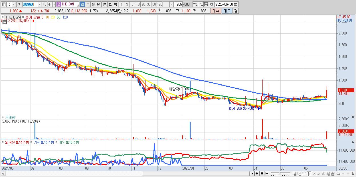 - THE E&M (1,030원 ▲ 14.7% , 시총: 251억, 거래량: 2,863,190, 거래대금:29억)