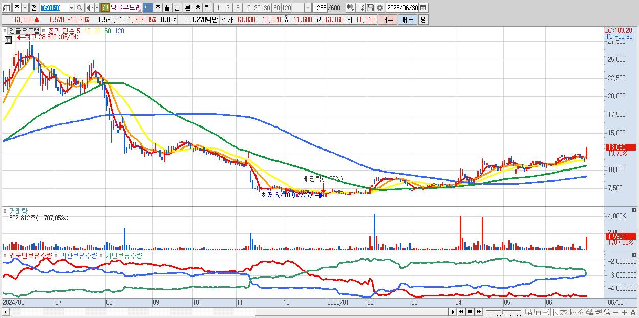 - 잉글우드랩 (13,030원 ▲ 13.7% , 시총: 2,589억, 거래량: 1,592,812, 거래대금:203억)
