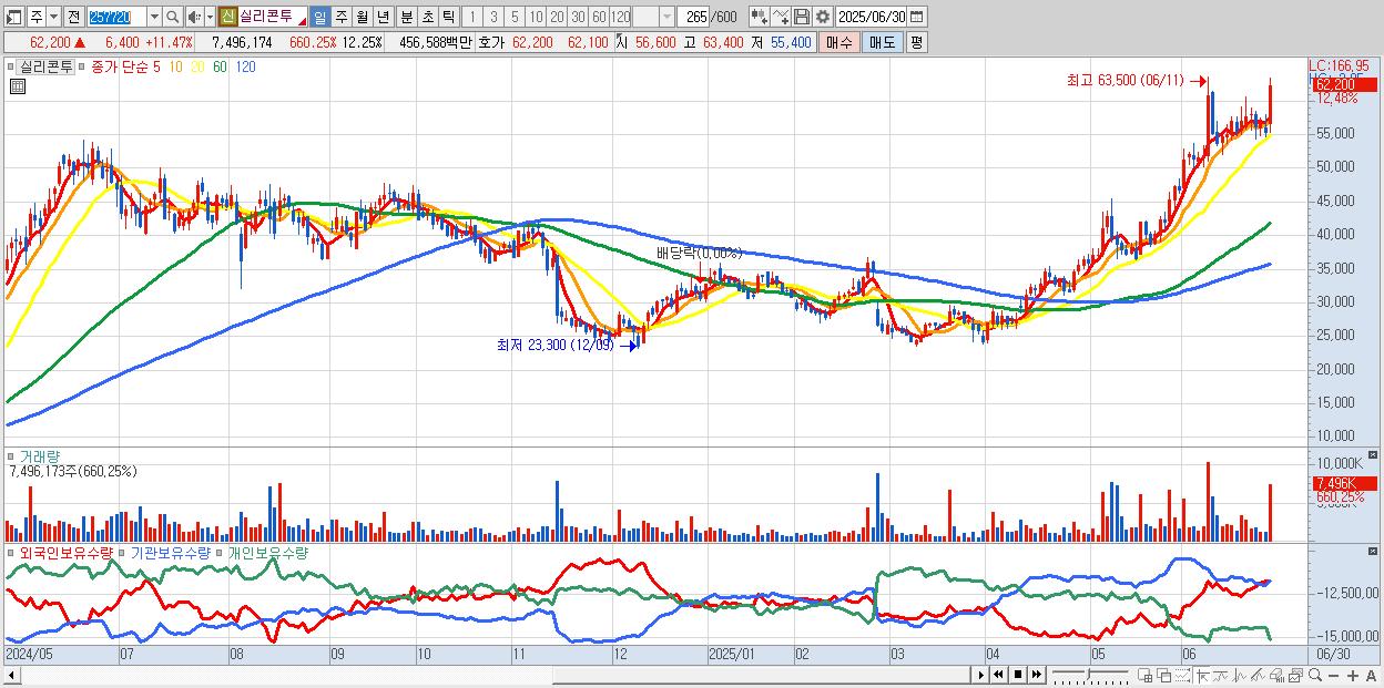 - 실리콘투 (61,700원 ▲ 10.57% , 시총: 37,743억, 거래량: 4,350,943, 거래대금:2,651억)