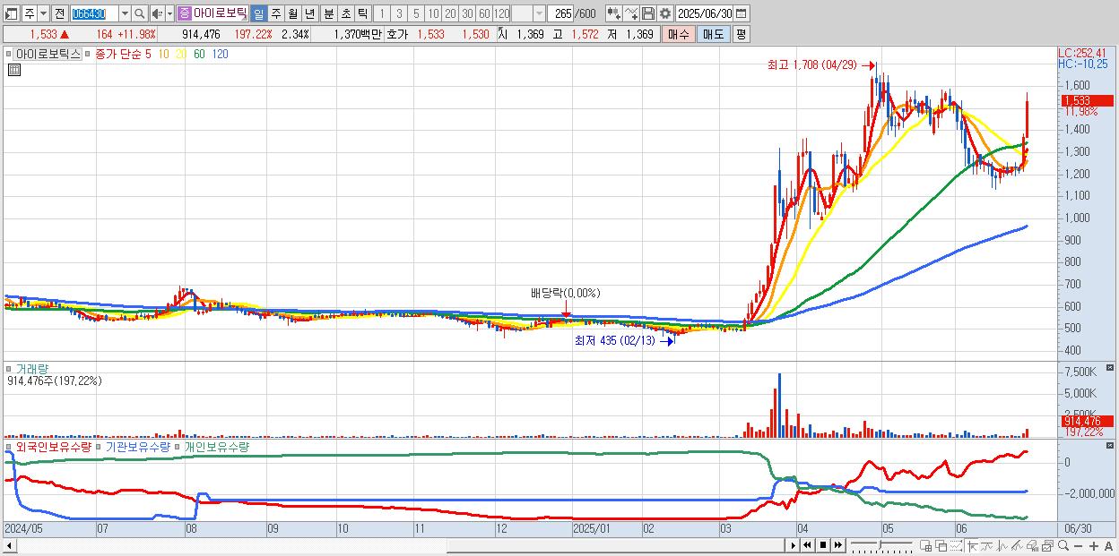 - 아이로보틱스 (1,533원 ▲ 11.98% , 시총: 600억, 거래량: 914,476, 거래대금:14억)