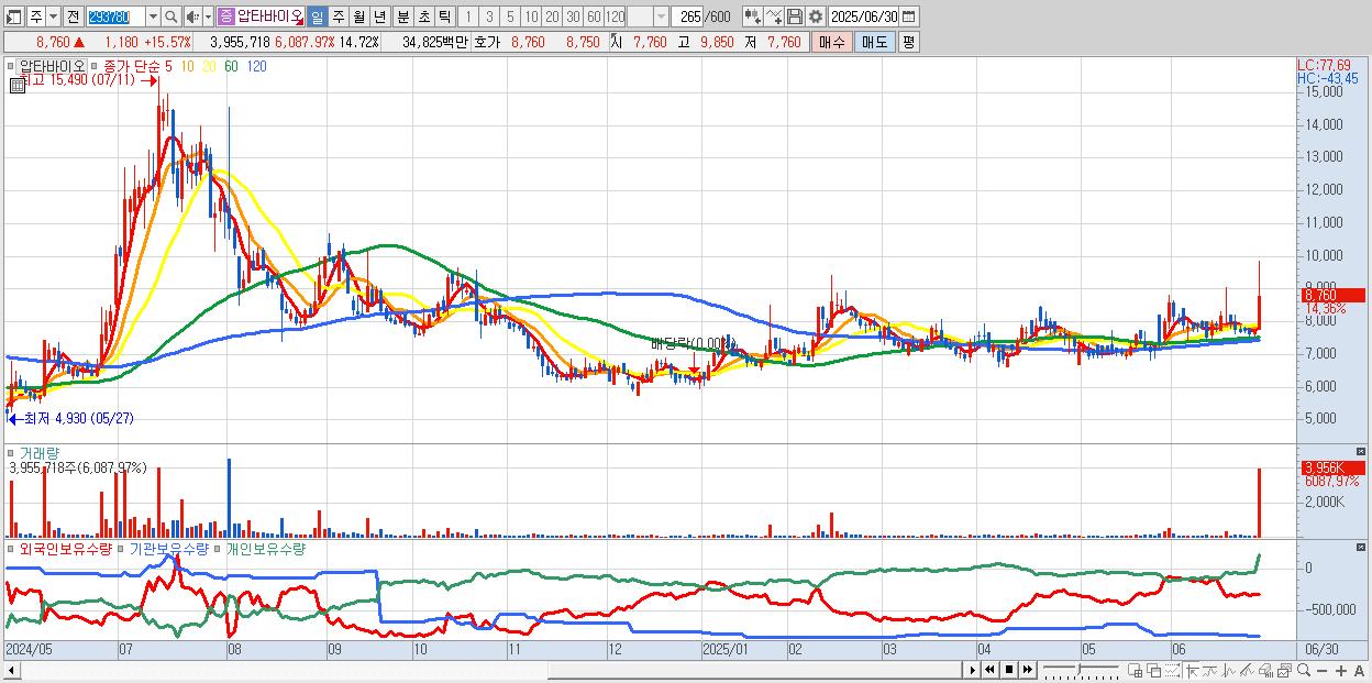 - 압타바이오 (8,650원 ▲ 14.12% , 시총: 2,325억, 거래량: 1,845,515, 거래대금:161억)