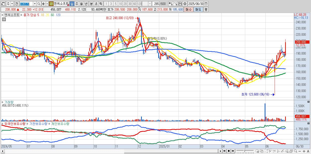 - 엔씨소프트 (206,500원 ▲ 11.2% , 시총: 44,488억, 거래량: 292,068, 거래대금:599억)