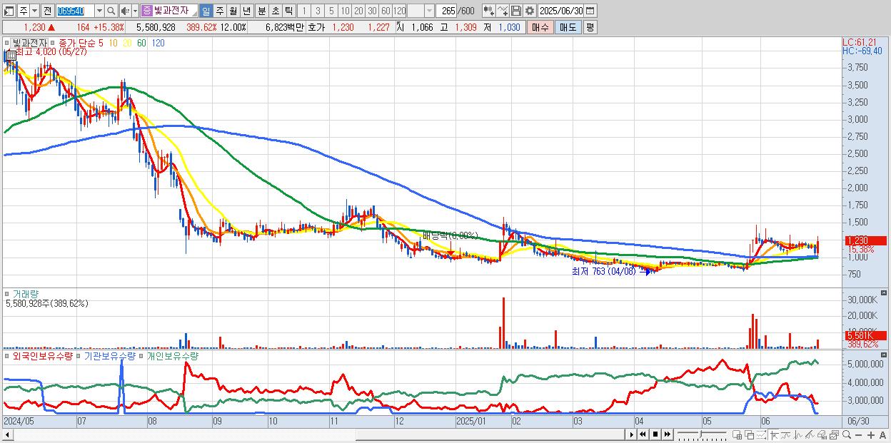 - 빛과전자 (1,230원 ▲ 15.38% , 시총: 572억, 거래량: 5,580,928, 거래대금:68억)