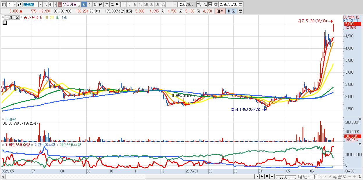 - 우리기술 (5,000원 ▲ 12.99% , 시총: 8,277억, 거래량: 38,135,999, 거래대금:1,850억)