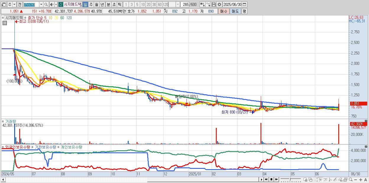 - 시지메드텍 (1,051원 ▲ 16.78% , 시총: 1,085억, 거래량: 42,301,737, 거래대금:455억)