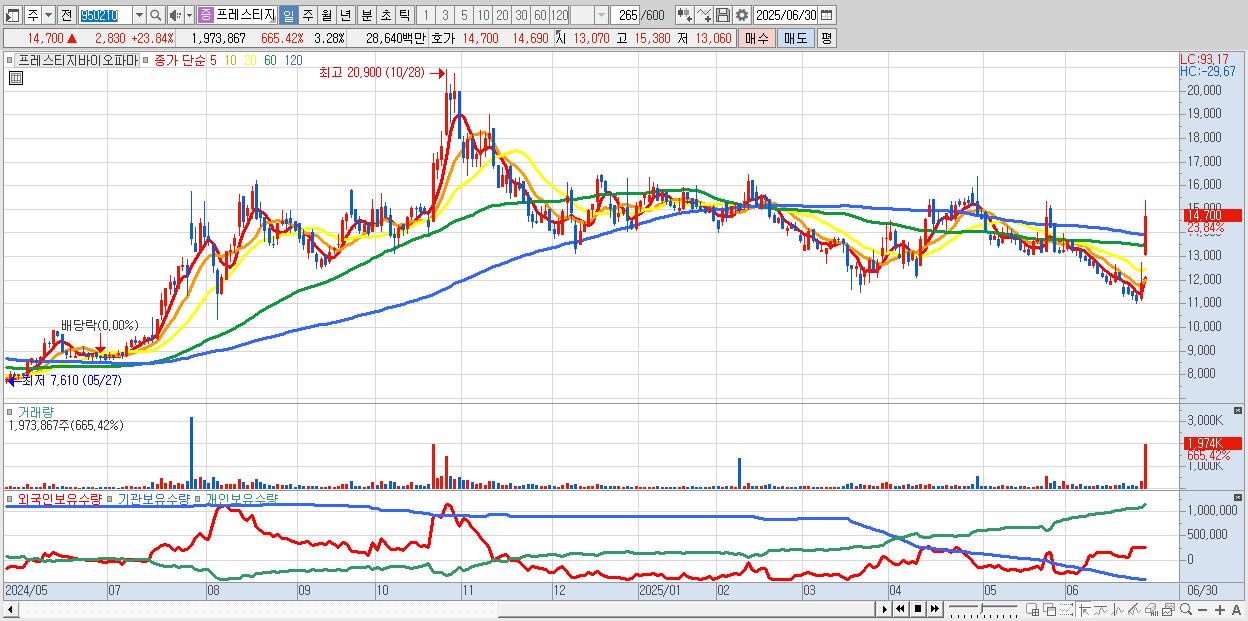 - 프레스티지바이오파마 (14,700원 ▲ 23.84% , 시총: 8,834억, 거래량: 1,973,867, 거래대금:286억)