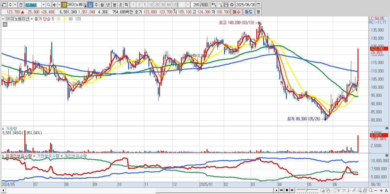 - SK이노베이션 (122,400원 ▲ 25.15% , 시총: 184,867억, 거래량: 3,309,175, 거래대금:3,791억)