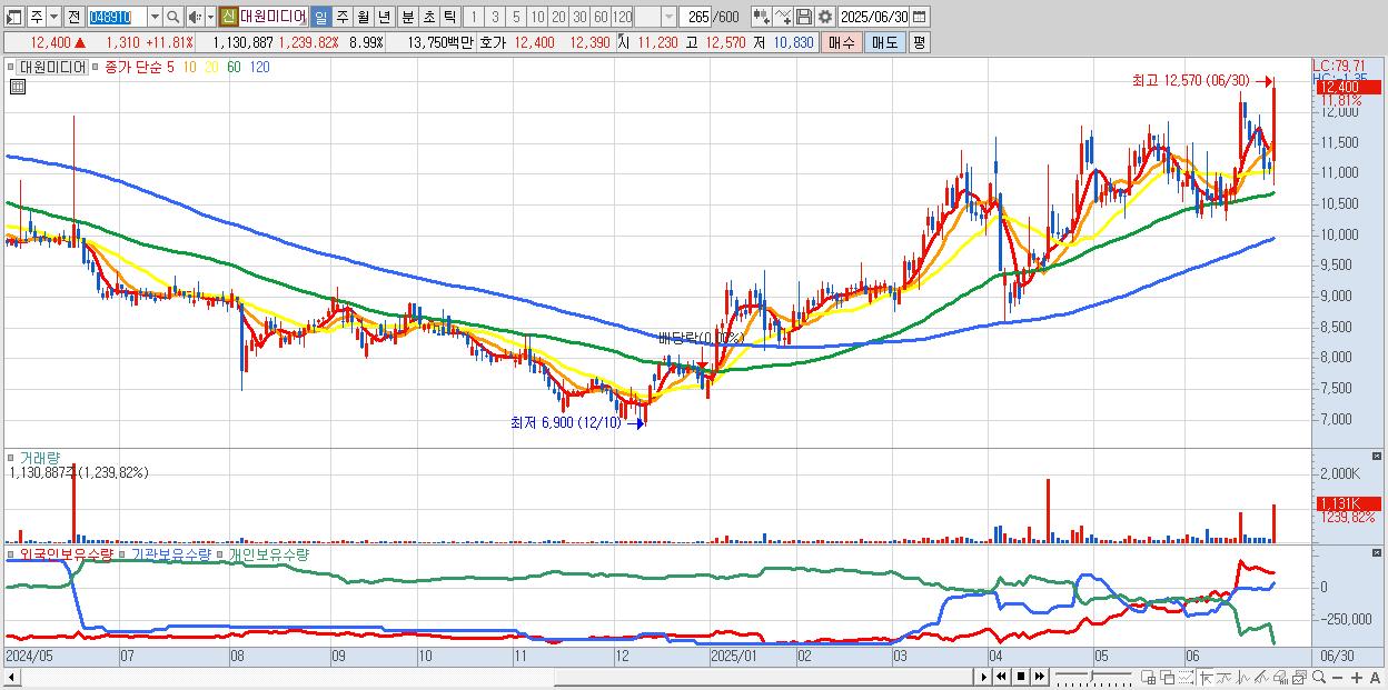 - 대원미디어 (12,400원 ▲ 11.81% , 시총: 1,560억, 거래량: 1,130,887, 거래대금:138억)