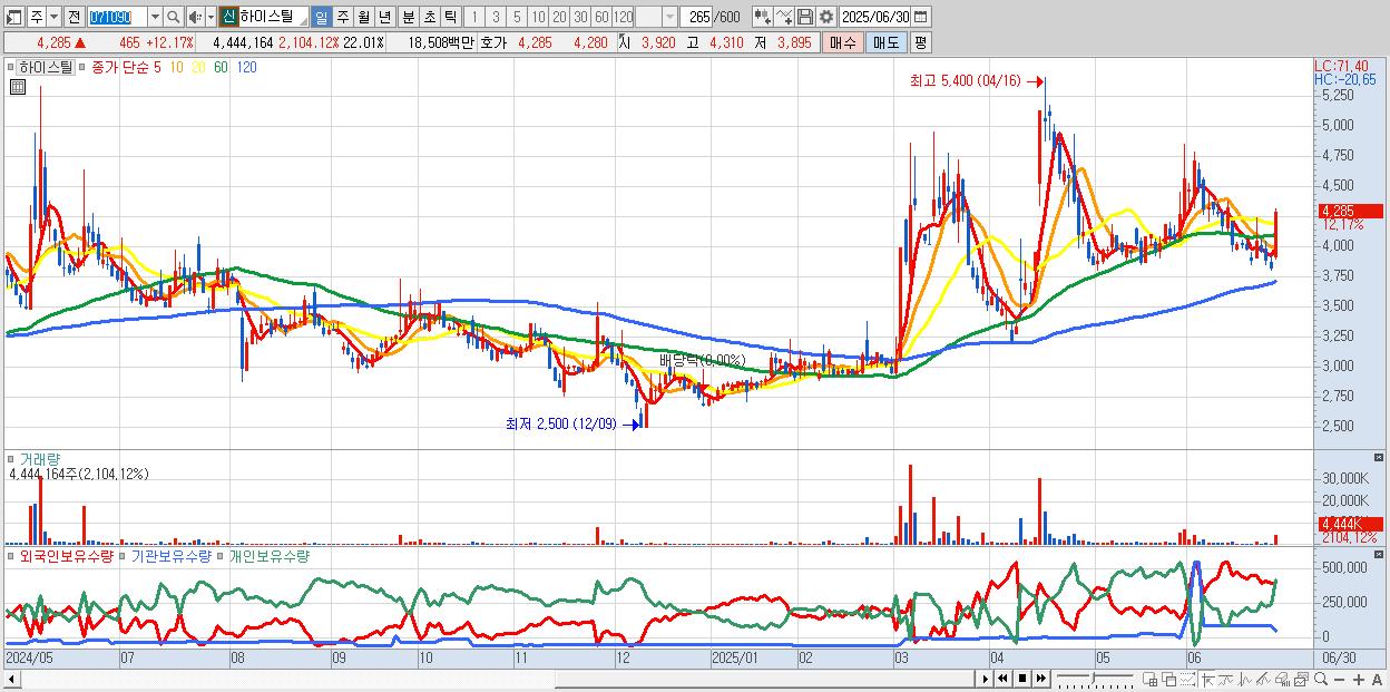 - 하이스틸 (4,285원 ▲ 12.17% , 시총: 865억, 거래량: 4,444,164, 거래대금:185억)