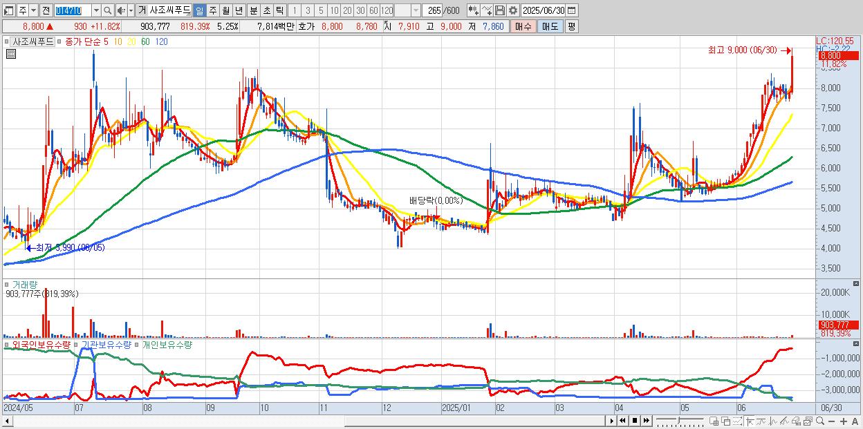 - 사조씨푸드 (8,800원 ▲ 11.82% , 시총: 1,515억, 거래량: 903,777, 거래대금:78억)