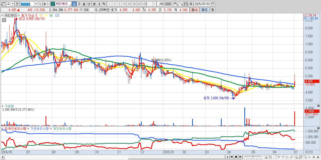 - 씨티케이 (4,685원 ▲ 10.5% , 시총: 906억, 거래량: 3,384,996, 거래대금:163억)