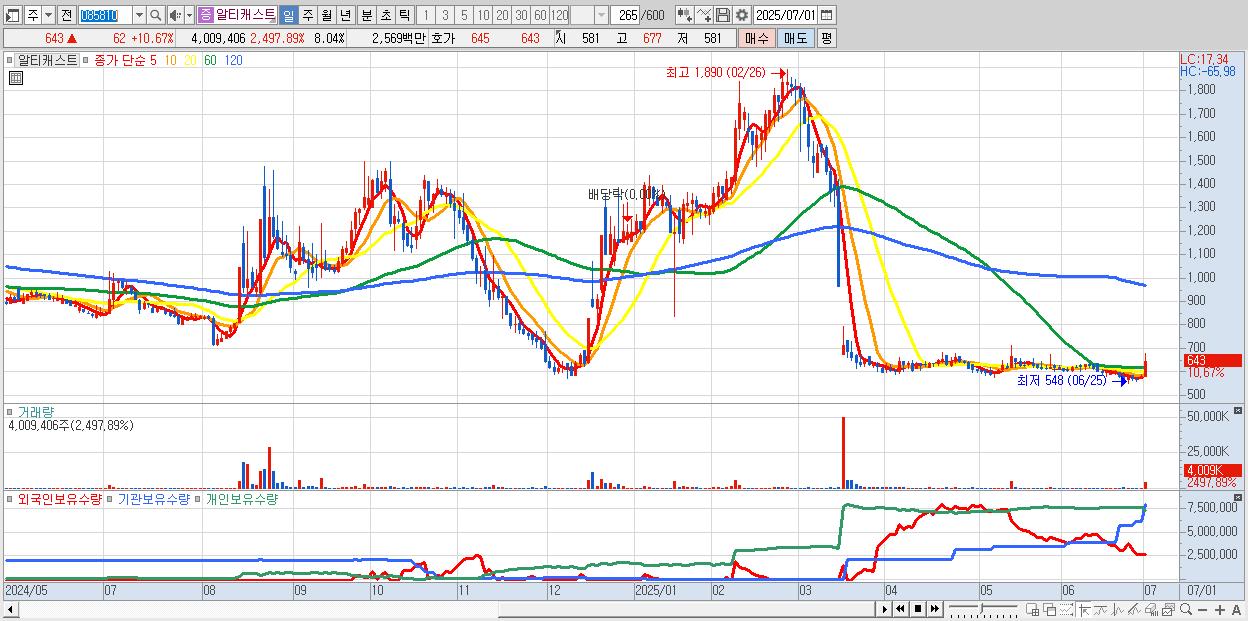 - 알티캐스트 (643원 ▲ 10.67% , 시총: 321억, 거래량: 4,009,406, 거래대금:26억)