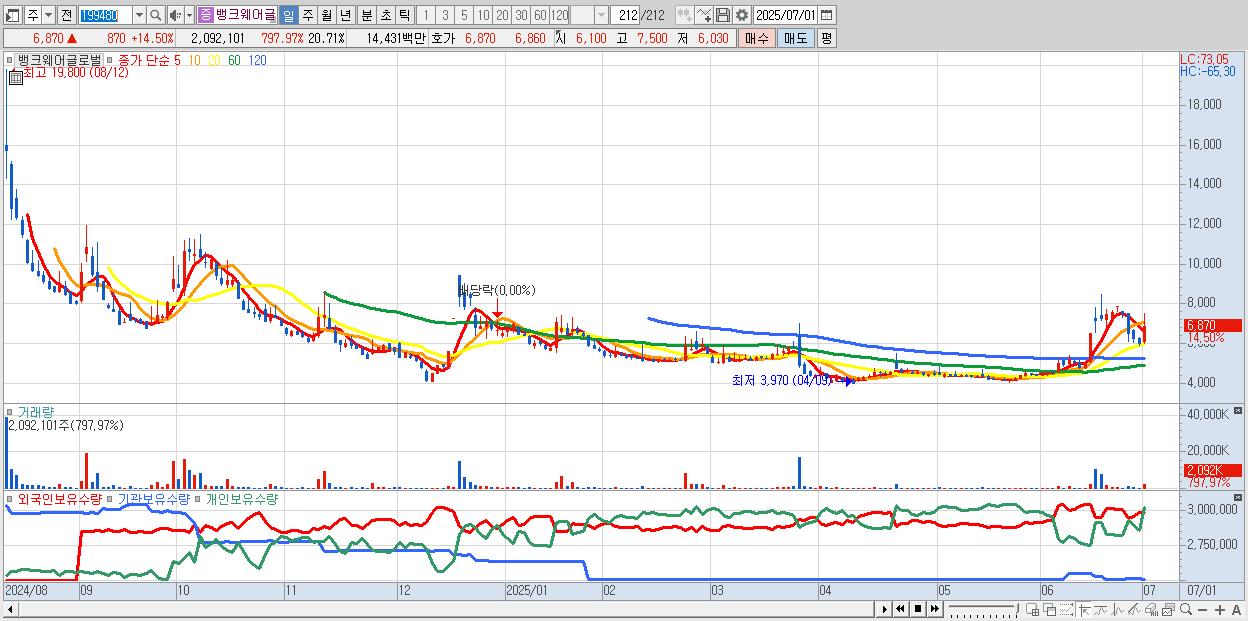 - 뱅크웨어글로벌 (6,870원 ▲ 14.5% , 시총: 694억, 거래량: 2,092,101, 거래대금:144억)